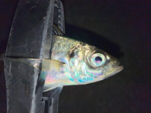 するとこの移動がBINGO!! 移動後の1投目、キャストしていつもの様に軽いリフト&フォールを繰り返していると、フッとラインのテンションが抜ける違和感があって、この日の口開けの1匹をゲット。時刻は19:19のことで、サイズはギリギリの指3本。少しは太くなっているだろうと期待していたので、これには正直な所ガッカリ。もう少し太ければ、お持ち帰りしても良いが、この太さでは・・・とノータッチで海にお帰り願った。そして、その直後の19:24に、今度はコツッと感じる反応で、2匹目をゲット。しかし、これもギリギリ指3本だったので、即、ノータッチ・リリース。