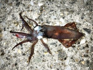 ヒイカの群れが回って来ることを願いながらキャスティングを繰り返していると、ゴミが掛かった様な感触で、この日最初のヒイカをゲット。時刻は17:19で、思いの外早い時刻だったので、思わずニヤリ。