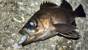 所で今回使用するワームだが、ECOGEARのアジマストLBを選択してみた。このワームはアジ用で普通のワームよりもかなり大きく3.3″(8.4cm)もあり、メーカーの謳い文句では大型アジ攻略用とのこと。しかし、メバルにとって見付け易くするには大きな方が良いだろうと考えたもの。更に、大きいため自重もあるので、ベイト・タックルで扱うには都合が良いだろうと考えた次第。